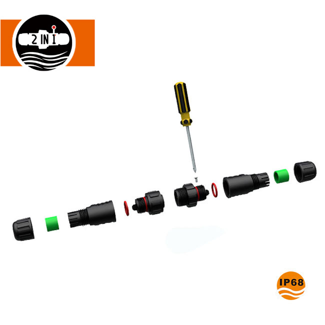 Penyambung Perempuan Lelaki Kalis Air M14, penyambung kalis air jenis skru 2 tiang, dengan terminal skru untuk sambungan yang mudah.